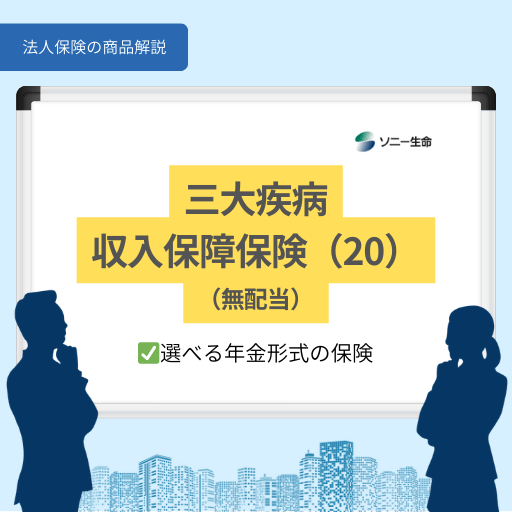 ソニー生命「三大疾病収入保障保険(20)」は、がん・急性心筋梗塞・脳卒中により就労や収入に影響が出た場合の資金不足に備える法人向けの収入保障型保険です。